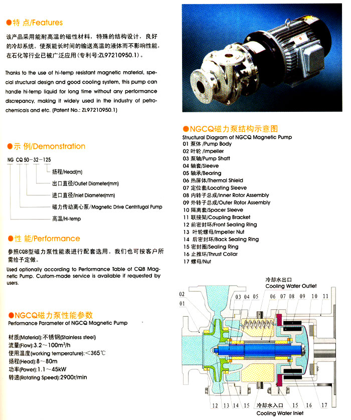 NGCQ型(耐高溫)≤450℃(水冷卻)磁力泵是采用內(nèi)外磁鋼推拉傳遞,磁路中間采用隔離套將液體封閉在隔離套內(nèi),以靜密封取代動(dòng)密封,使泵的過(guò)流部件處于密封狀態(tài),解決了其它泵的機(jī)械密封無(wú)法避免的跑、冒、滴之弊病。磁力泵選用耐腐蝕、高強(qiáng)度的工程塑料、鋼玉陶瓷、不銹鋼作為制造材料,因此具有良好的抗腐蝕性能,并可使被輸送介質(zhì)免受染。